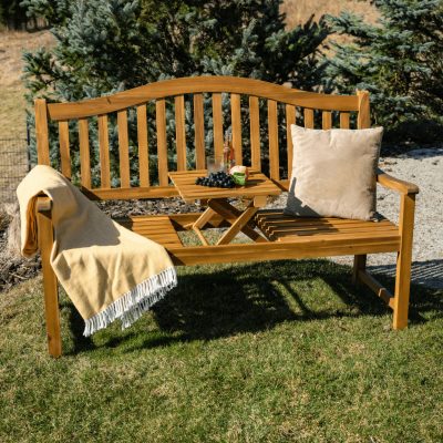 Anyag: tömör akácfa Szín: akác Méretek (SzxMéxMa): 150x64x104 cm Ülés szélessége: 140 cm Ülés magassága: 45 cm Ülés mélysége: 48,5 cm Háttámla magassága: 59 cm Háttámla szélessége: 140 cm Magasság a talajtól a kartámaszig: 66 cm Teherbírás: 170 kg Súly: 19 kg Kihúzható asztalkával Asztal méretei (SzxMéxMa): 39,5x45,5x20,5 cm Lekerekített háttámla Ellenáll az időjárás viszontagságainak Javasoljuk, hogy védje a terméket a kedvezőtlen időjárási viszonyoktól, hogy meghosszabbítsa a termék élettartamát Praktikus Modern Szétszerelve szállítva