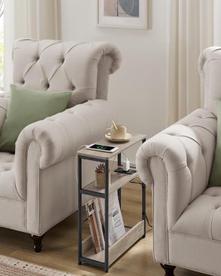 Kis oldal asztal töltő funkcióval, kis dohányzóasztal, 3 polcos, magazintartó, nappaliba, hálószobába, dolgozószobába, Greige szürke-tinta fekete