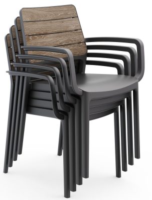 A strapabíró, UV- és időjárásálló műanyag szerkezet hosszú távon ellenáll a kültéri környezet kihívásainak, miközben a karfák fokozzák az ülés kényelmét. Az egymásra rakható kialakítás leegyszerűsíti a tárolást, a könnyű tisztíthatóság pedig minimális karbantartási igényt jelent. Az ashwood/grafit színkombináció világos, modern hatást ad, amely beltéren és kültéren egyaránt jól érvényesül.
