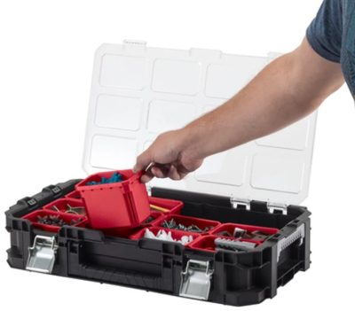 Az apró alkatrészek tárolásához kivehető, különböző méretű rekeszekkel rendelkezik. Az átlátszó polikarbonát fedelének köszönhetően a benne tárolt tárgyak folyamatosan láthatóak maradnak.