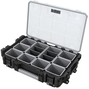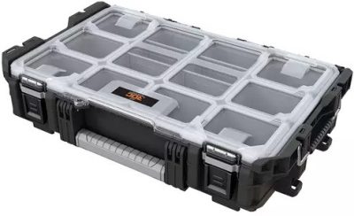 A ROC Pro Gear 1.0 Rendszerező kompakt kialakításával és strapabíró szerkezetével olyan szakembereknek való, akik funkcionális, hordozható és strapabíró rendszerezőt keresnek, amely nap mint nap képes elvégezni a munkát. Ez a tartós, nagy ütésállóságú műanyagból készült professzionális rendszerező fém retesszel és három fogantyúval rendelkezik, amelyek többféle hordozási lehetőséget kínálnak. Tartalmaz 8 kis és 2 széles kivehető tárolót a munka közbeni gyors hozzáférés érdekében. A víz- és porálló peremmel kiegészített szervezővel mindenféle időjárási körülmények között dolgozhatsz. A ROC Pro Gear 1.0 Rendszerező kompatibilis a moduláris és egymásra rakható Professional Tool Storage Rendszer 1.0 és 2.0 (kivéve a kompakt rendszerezőt) szerszámtároló rendszerrel.