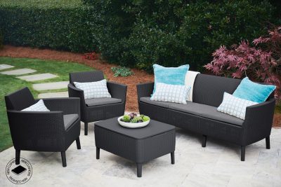 A SALEMO típusú bútor garnitúra elegáns, modern és retro stílusú rattan utánzatú öntött műanyagból készült. A két fotelből, egy háromszemélyes kanapéból és egy funkcionális asztalból álló szett kiválóan ellenáll az időjárási viszonyoknak és az UV sugárzásnak is. A szettet kültéren és beltéren egyaránt lehet használni. A készlet tartalmazza a stílusos párnákat is, melyeket a funkcionális asztalban lehet tárolni.