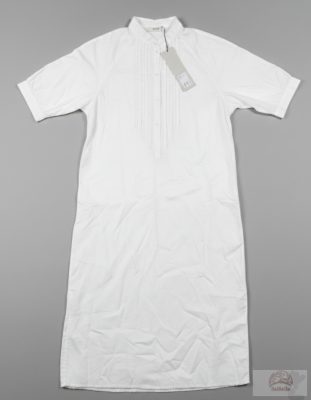Ez a lágy esésű, hófehér lenruha ideális választás azoknak, akik értékelik a kifinomult, mégis természetes stílust. A ruha különlegessége a frontrészen található, precízen kidolgozott rakott díszítés, amely textúrát és egyedi karaktert kölcsönöz a darabnak.