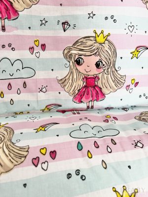 Egy varázslatos világ vár minden kislányt, ahol koronás királylányok, csillogó ruhák és mesebeli kastélyok elevenednek meg lefekvés után. A Királylányos gyerek ágynemű szett finom rózsaszín alapon tündéri hercegnőmintákkal készült – álomszép választás minden kis álmodozónak, aki szeretne maga is hercegnővé válni.