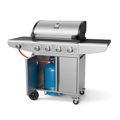 A dupla falú fedél hatékonyan tartja bent a hőt, míg a beépített hőmérő segítségével folyamatosan ellenőrizhető a sütési hőmérséklet. A grill kialakítása praktikus megoldásokat kínál: oldalsó polcok, alsó szekrény a gázpalack számára, kiegészítőtartó kampók és palacknyitó teszik kényelmessé a használatot.