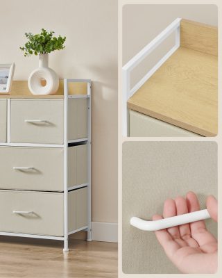 A jó anyagok magukért beszélnek: A szövet fiókelőlapok faforgács és fém kerettel kombinálva - egy masszív és tartós komód jött létre, amely bárhová könnyen tolható.