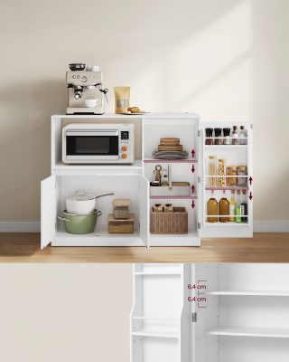 • Egyszerű rendszerezés:a 53 x 35 x 40 cm-es nyitott rekesz a mikró számára, a jobb oldali ajtón található 3 polc, valamint a belső, magasságban állítható 2 polc, továbbá egy zárt alsószekrény a ritkábban használt tárgyak számára.