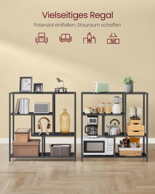 • Praktikus és elegáns: a szabadon álló polc különböző magasságú nyitott polcokkal rendelkezik, és különböző méretű tárgyak elhelyezésére alkalmas. Emellett egyedi és stílusos varázst ad otthonának
