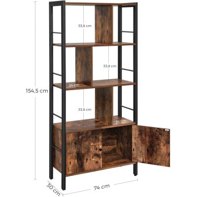 könyvespolc, tárolópolc, nagy ajtós könyvespolc, 4 polc, stabil acélszerkezet, ipari stílusú, nappaliba, irodába, rusztikus barna és fekete