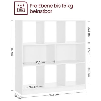 • Tágas és praktikus: 97,5 x 100 x 30 cm (Sz x Ma x Mé), a térelválasztó polc két nyitott rekesszel és egy hátsó rekesszel rendelkezik, amely sokféleképpen és könnyen hozzáférhető módon megtölthető könyvekkel, ajándéktárgyakkal és dekorációkkal.