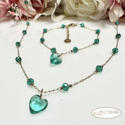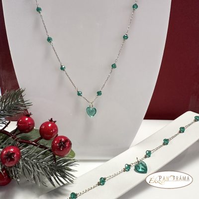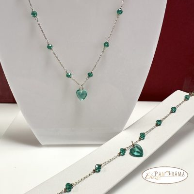 Finom kidolgozású, antiallergén arany színű láncon zöld kristály gyöngyök és szív medállal!
