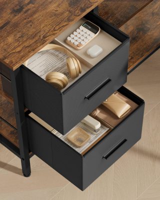 L alakú íróasztal 2 tágas fiókkal, játékasztal monitorállvánnyal, sarokasztal, számítógépes íróasztal állítható tárolópolccal, otthoni irodába, rusztikus barna:
