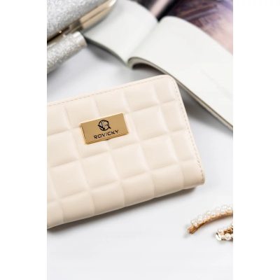 Ez a kis méretű női pénztárca tökéletes választás mindennapi használatra és különleges alkalmakra is. Kifinomult arany veretei, valamint dombornyomott, négyzetmintás külső felülete modern és fényűző megjelenést biztosít. A Rovicky márka arany logója tovább fokozza a pénztárca eleganciáját.