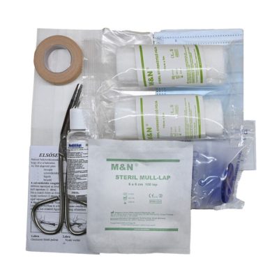 6/1990. KÖHÉM szabvány által meghatározott tartalmú elsősegély doboz.