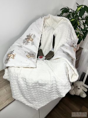 A takaró külső rétege 100% OEKO-TEX minősítésű pamutvászon, amely kiválóan szellőzik, természetes és bőrbarát. A krém wellsoft bélés bolyhosan puha, meleg és különösen kellemes érzetet ad, így a babák szívesen simulnak bele – akár alváshoz, akár utazáshoz használják. A vastag antiallergén poliészter vatelin töltet biztosítja a megbízható hőszigetelést anélkül, hogy túlhevülne a baba teste.
