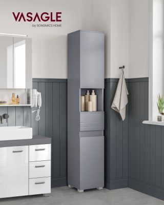 VASAGLE magas fürdőszobai szekrény, keskeny tárolószekrény, karcsú szekrényke fiókkal, állítható polcokkal, 30 × 30 × 170 cm, misztikus szürke színben