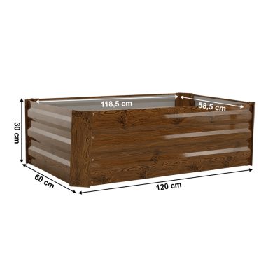 Virágágy anyaga: acél/alumínium Szín: barna/mintás fa Külső méretek (SzxMéxMa): 120x60x30 cm Belső méretek (SzxMéxMa): 118,5x58,5x30 cm Anyagvastagság: 0,3 mm, sarok 0,8 mm Alkalmas bentre és kintre Alj/padló nélkül szállítva Könnyű összeszerelés Acél porszórt felületkezeléssel Gyógynövényekhez, virágokhoz vagy zöldségekhez Különböző igényű növényekhez Nagyobb védelem a csigák ellen Kisebb hajlam a gyomnövekedésre Ideális tápanyagszegény talajú helyekre A legkisebb kertekbe is alkalmas Modern dizájn Sokoldalú felhasználás Alkalmas ajándékként Bontásban szállítva