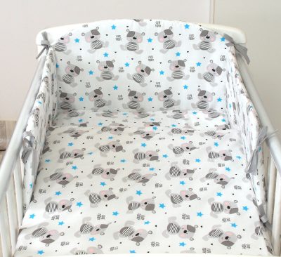 A bőrbarát 100%-os Pamutvászonból készült Baby Bear kollekció rácsvédő körbe-körbe kipárnázza a babaágyat, megóvja a folyton izgő-mozgó Kicsit az esetleges, rács okozta sérülésektől. Kényelmes, kis bújós fészekké alakítja át a fekhelyét, hogy kisbabád alvás és játék közben is biztonságban érezhesse magát.