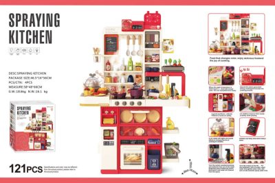 Mama Kiddies Interaktív "Spraying Kitchen" Játékkonyha – 121 darabos készlet,103 cm magas fény- és hangeffektekkel piros színben