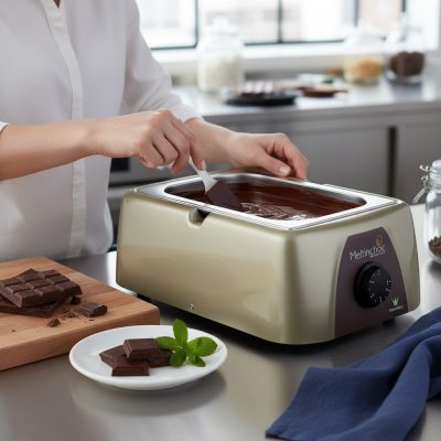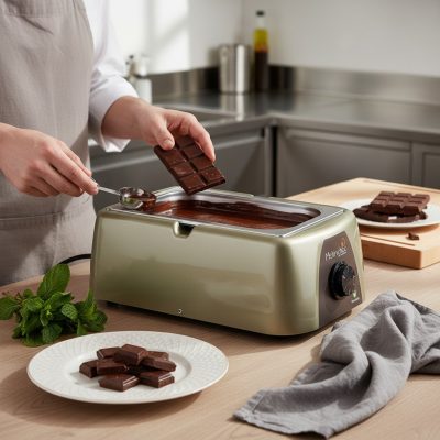 • Száraz olvasztás: A száraz olvasztási technológia egyenletes hőelosztást biztosít a tartályban, megakadályozva a csokoládé leégését és biztosítva a tökéletes olvadást. Nem igényel vízfürdőt, ami egyszerűbbé teszi a használatot és a tisztítást.