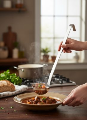 Ez a merőkanál nem mérőeszköz, hanem adagoló: akkor működik igazán jól, amikor fontos az egységes tálalás és a tempó.