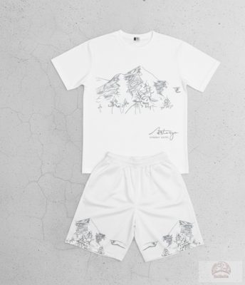 Egyedi Grafika: A pólón és a nadrágon látható hegyvidéki vázlatok és fenyőerdő motívumok nem tömeggyártott minták – a szabadság és a kalandvágy szimbólumai.