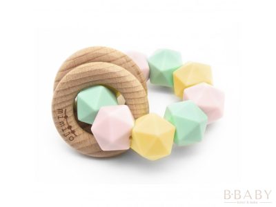 Mimijo szilikon rágóka 2 bükkfa karikával – Linda | Színes bababarát rágóka és csörgő fogzási időszakra