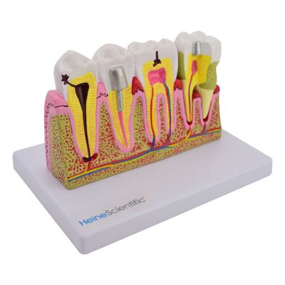 A modell a beteg őrlőfogakkal a különböző fogászati betegségek és a lehetséges kezelések hosszmetszetét mutatja be. A mélyebben fekvő struktúrák, erek és idegek részletesen ábrázolva vannak. Az olyan betegségek, mint a szuvas fogak, az ínygyulladás és a parodontitis vizuálisan is elmagyarázhatók.
