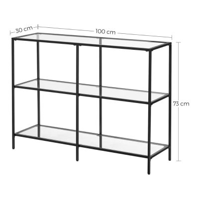 konzolasztal, polc, 3 polc edzett üvegből, előszoba asztal, 30 x 100 x 73 cm, fém keret, modern, előszoba, nappali, hálószoba, klasszikus fekete átlátszó LGT027B01: