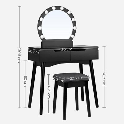 fésülködőasztal-készlet tükörrel és villanykörtékkel sminkeléshez, kozmetikai asztal 2 nagy csúszó fiókkal és párnázott székkel, fekete: