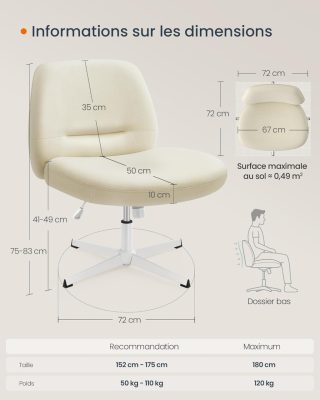 Forgószék, Sminkszék, Forgószék karfa nélkül, Asztali szék, Széles ülés, Modern, Kereszttalppal, Állítható magasságú, Ringató funkció, krémfehér: