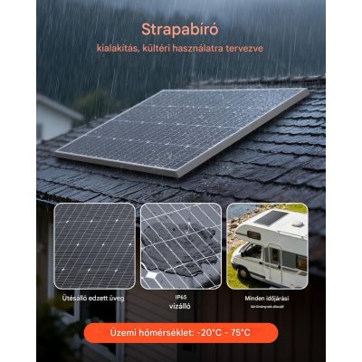 A panel masszív alumínium kerettel készült, amely hosszú élettartamot és kiváló ellenállóságot biztosít a külső behatásokkal szemben. Az IP65 védettség gondoskodik arról, hogy a napelem ellenálljon az időjárási viszonyoknak, így kültéri használatra is tökéletes választás.
