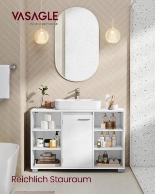 • Mindennek megvan a helye: A 6 nyitott rekesz és a 2 tágas, ajtó mögötti rész bőséges helyet kínál ennek a 30 x 90 x 60 cm-es mosdó alatti szekrénynek a mindennap használt fürdőszobai kellékek számára