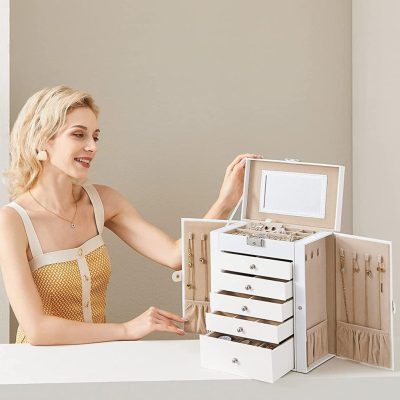 • [Belső tükörrel és zárral] Az ékszertartó belsejében egy tükör található, amely lehetővé teszi a smink elkészítését és a megjelenés egyszerű ellenőrzését, így értékes reggeli időt takaríthat meg;2 kulccsal ellátott zárral rendelkezik, hogy távol tartsa értékeit a szemtelen gyerekektől