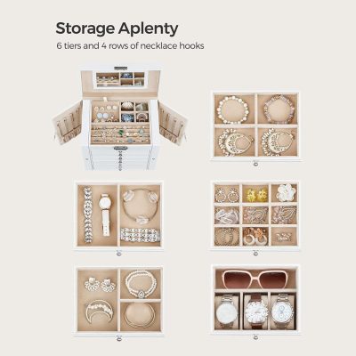 Nagy ékszerdoboz, 6 szintes ékszertartó oldalszárnyakkal, fiókokkal, tükörrel és csattal, karkötőhöz Fülbevaló Gyűrű Nyaklánc Óra, Ajándékötlet, Fehér: