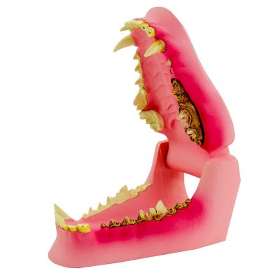 Ez a modell egy kutya egészséges fogazatát mutatja a jobb oldalon és patológiásan befolyásolt fogazatát a bal oldalon.