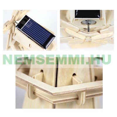 Napelemes játék, fa szélmalom. Napelem segítségével meghajtott villanymotor a szélmalmot forgatni kezdi megfelelő napsütés esetén.