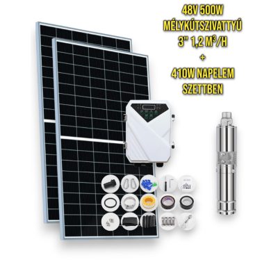 Napelemes öntöző szivattyú készlet 48V 500W mélykútszivattyú 1,7 m³/h 109 méter emelés, 2 x 430W napelem, szolár szabályzó - öntözés mélykút szivattyúval és napenergiával!