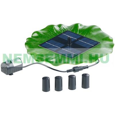 Vízen úszó napelemes szökőkút cserélhető szórásképű fejekkel, nagy lótuszlevél formájú.
