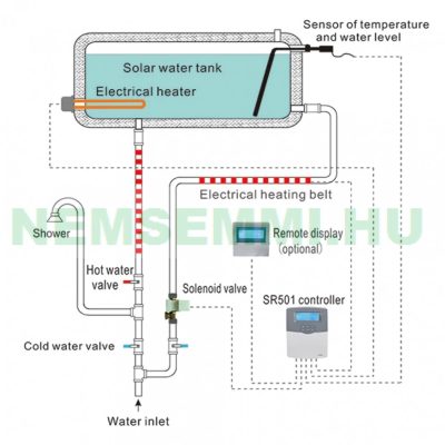 Napkollektor fűtés vezérlés SR501 20 méter kábel a hőmérőhöz + vízszint érzékelő + mágnes szelep tartályos napkollektorhoz NTC10K szenzorral