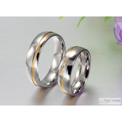 Nemes acél férfi karika gyűrű ezüst színben, vékony arany díszítéssel a gyűrű teljes kerületén kicsit átlósan. A női méretben kővel kapható!