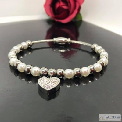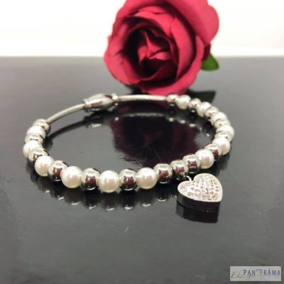 Kiváló minőségű acél női karkötő, az ezüst szín és a fehér gyöngy tökéletesen harmonikus egysége teszi elegánssá!. Mágneseses, biztonsági kapcsolóval záródik. Ajándékozásra igényes, szép meglepetés akár milyen alkalom is legyen.