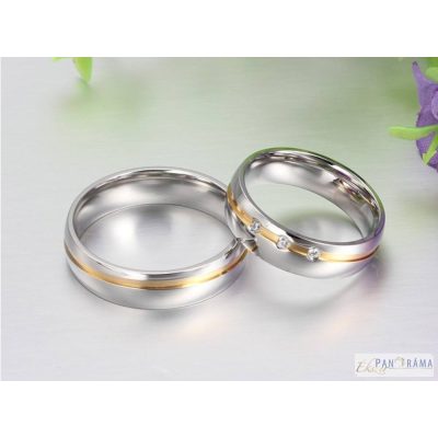 Nemes acél női karika gyűrű ezüst színben, vékony arany díszítéssel körben, közepén 4 pici kristállyal. Önálló gyűrűként, vagy jegy gyűrűként egyaránt alkalmas. Férfi méretben kő nélkül is kapható!