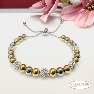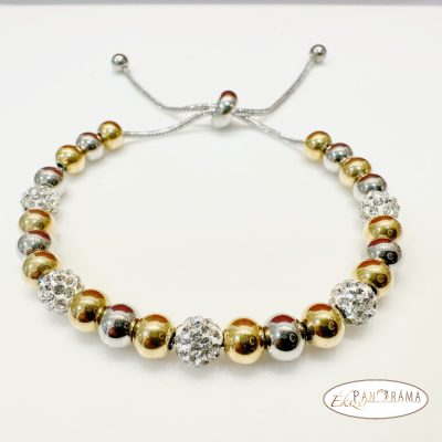 Acél karkötő, állítható mérettel, mágneses csúszózárral, csillogó shamballa kristály és arany-ezüst gyöngyök kombinációjával.