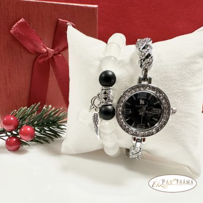 Ajándékcsomag - Ékszeróra ásvány karkötővel, ezüst-fekete színben