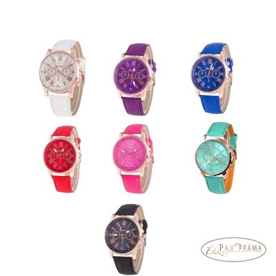 Női karóra, arany színű kerek tok, színes műbőr szíjjal