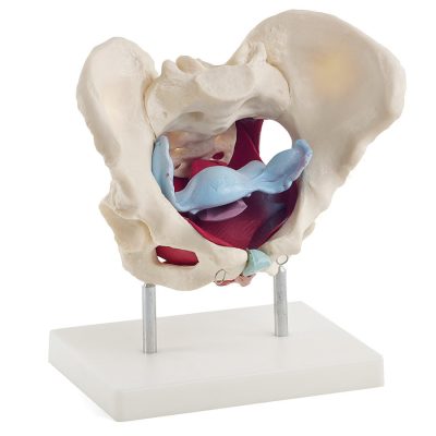 Ez az anatómiai modell a női medencét mutatja a medencefenék izmaival, a méhvel, a végbéllel, a hüvellyel és a szeméremtesttel. A medencemodell lágy részei rugalmas műanyagból, míg a csontos medence merev műanyagból készült.