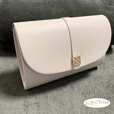 Igényes kidolgozású, női rostbőr alkalmi táska, púder rózsaszín színű, arany színű emblémával díszített
