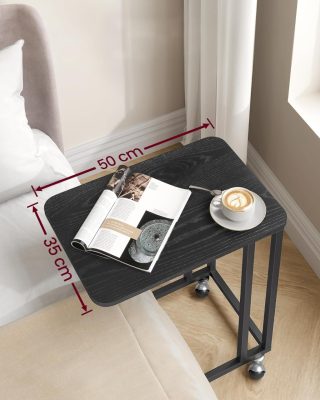 Oldalasztal acél vázzal és görgőkkel, kanapé alá csúsztatható asztal, fekete
