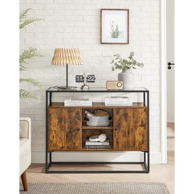 tálalószekrény, oldalsó szekrény, tálalószekrény, konyhai szekrény üvegfelülettel és nyitott rekeszekkel, nappali, Előszoba, stabil acélváz, edzett üveg, ipari formatervezés, vintage barna-fekete